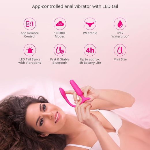 Features a rounded insertable head, flexible neck, and T-shaped flared base for secure, safe wear. The customizable LED tail pulses with vibrations, aids Bluetooth stability, and adds visual appeal for cam use or partner play (can be disabled).
